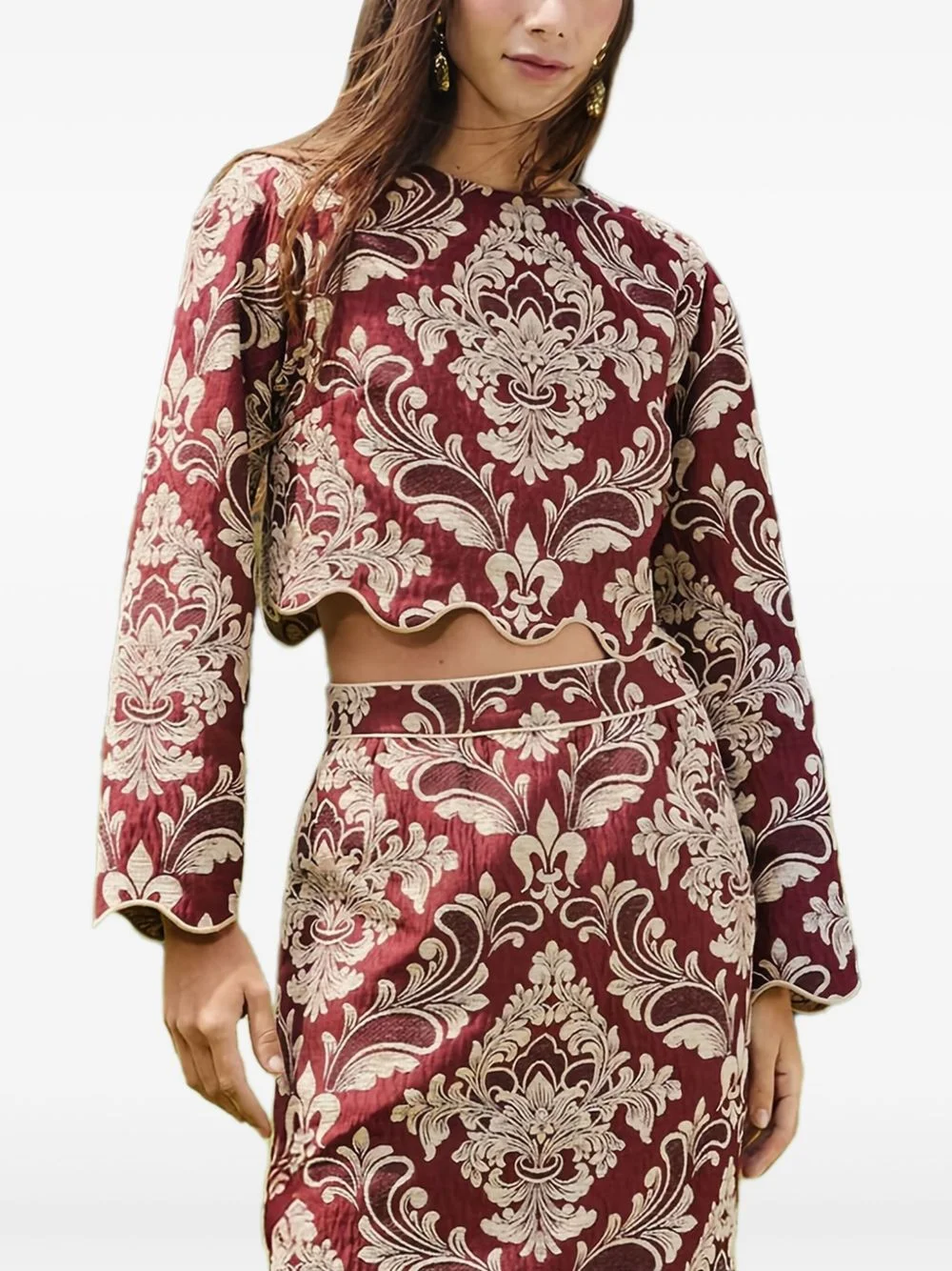 jacquard scalloped top Highlights - Burgundy - Jacquard pattern - Scalloped hem - Long sleeves - Button fastening at the rear Imported Composition Cotton 77%, Viscose 23% Washing instructions Machine Wash