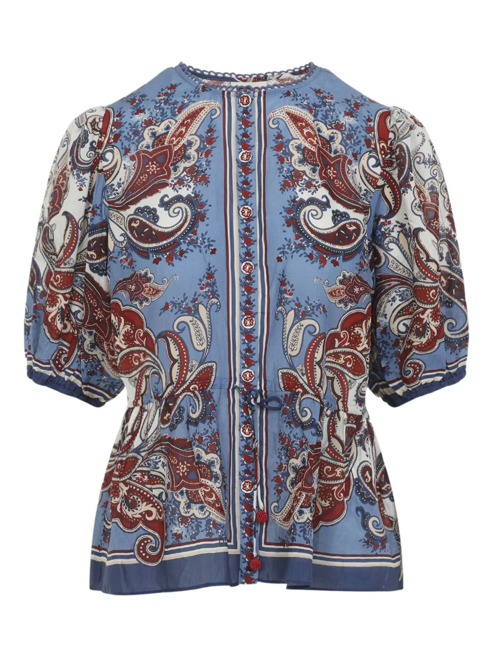 paisley scarf blouse Highlights - Cream - Paisley print - Button fastening - Drawstring - Puff sleeves - Scalloped trim - Border print Imported Composition Cotton 100% Washing instructions Read Manufacturer Guidelines