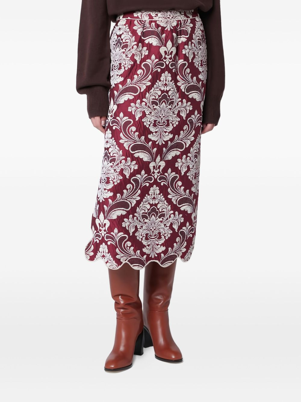 patterned-jacquard scallop-hem midi skirt Highlights - Red - Jacquard damask pattern - Scalloped hem - Side slit - Pencil design Imported Composition Polyester 77%, Viscose 23% Washing instructions Read Manufacturer Guidelines