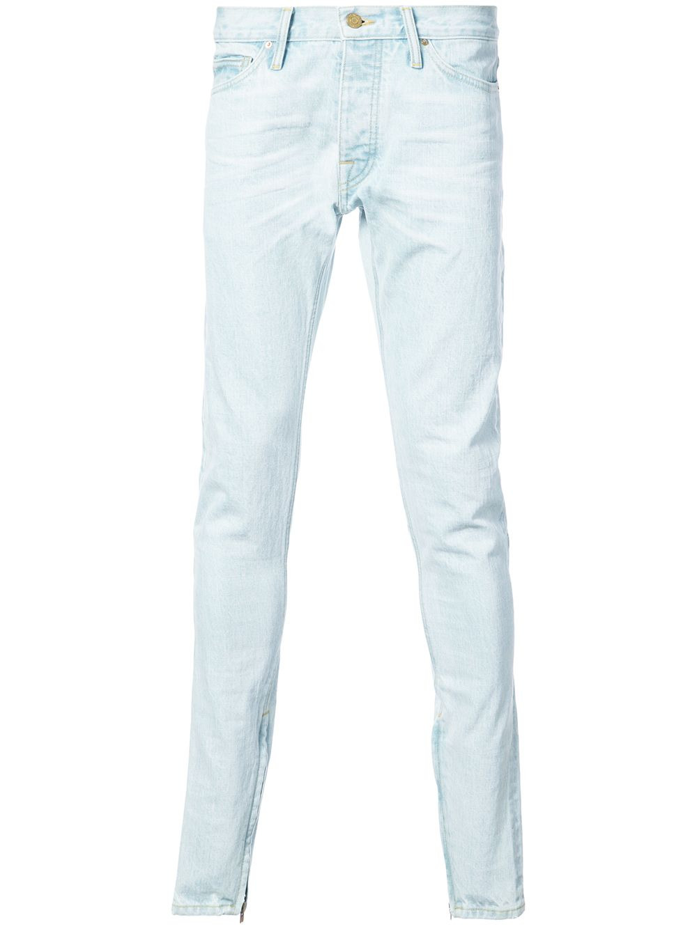 classic skinny jeans Light blue cotton classic skinny jeans from Fear Of God featuring a top button, a five pocket design, a skinny fit, a waistband with belt loops and a side slit to the ankles. Made in United States Composition Cotton 100% SIZE & FIT Model measurements Height 6 ft 1 in(1.85 m) Bust/Chest 33.85 in(86 cm) Hips 31.88 in(81 cm) Waist 29.92 in(76 cm)