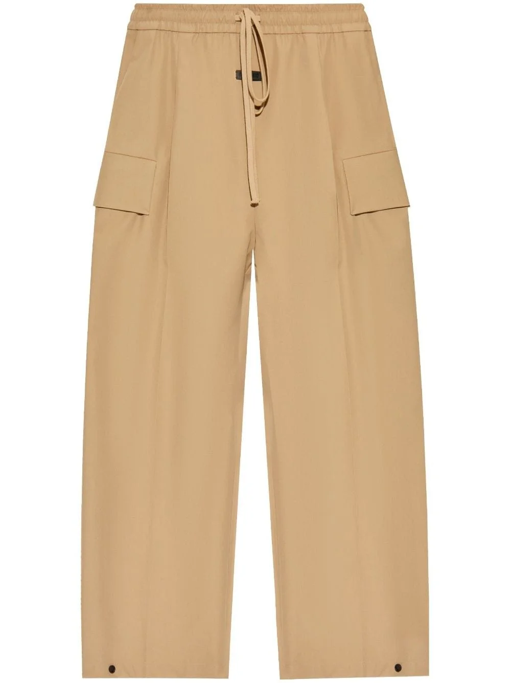 logo-patch wool trousers Highlights - Sand beige - Virgin wool - Pressed crease - Drawstring fastening waist - Elasticated waistband - Logo patch to the front - Two side slit pockets - Two side cargo pockets - Straight leg Made in Italy Composition Virgin Wool 100% Washing instructions Read Manufacturer Guidelines