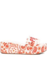 55mm Sunshine floral-print sandals Highlights - Off-white - Floral print - Platform sole - Embroidered logo - Open toe - Slip-on style Made in Italy Composition Lining: Fabric 100%, Calf Leather 100% Outer: Fabric 100% Sole: Rubber 100% SIZE & FIT Measurement HEEL 2.16 in(5.5 cm) PLATFORM 1.57 in(4 cm)