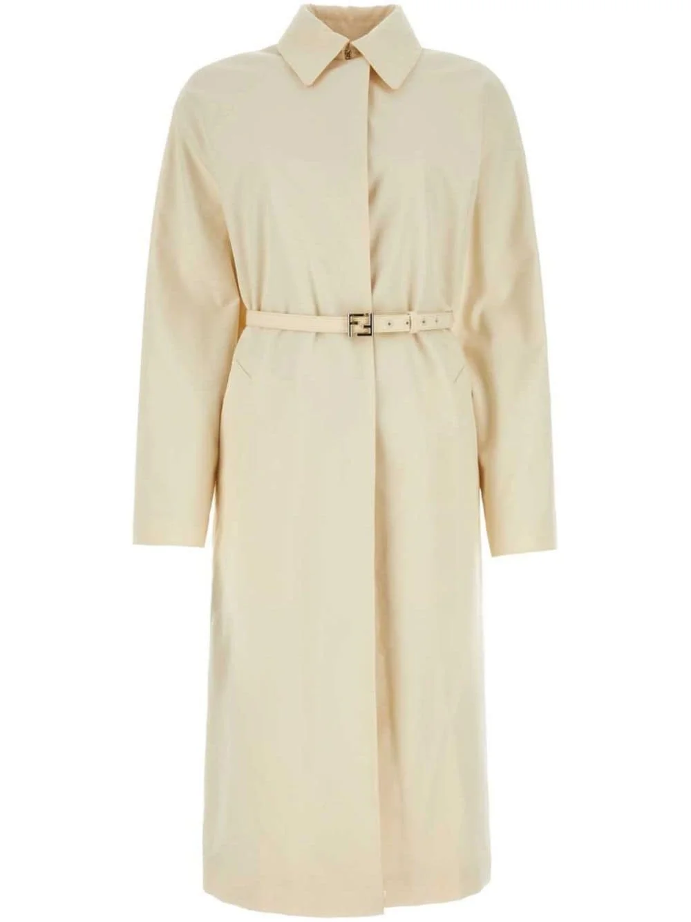 belted trench coat Highlights - Cream white - Cotton blend - Classic collar - Concealed front fastening - Belted waist - Two diagonal pockets to the sides - Long sleeves - Central rear vent - Straight hem Made in Italy Composition Outer: Nylon 100%, Polyester 67%, Cotton 33% Lining: Viscose 100%