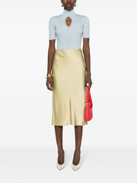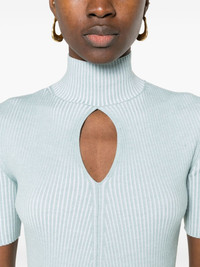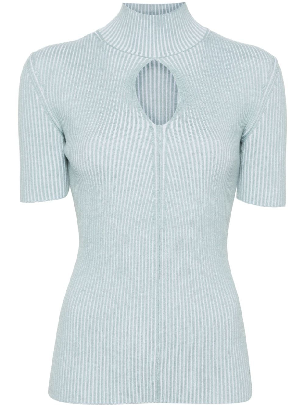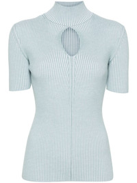 cut-out detail knitted top Highlights - Light blue - Wool blend - Stretch-design - Knitted construction - High neck - Short sleeves - Cut-out detailing at the front - Embroidered logo to the side - Straight hem Made in Italy Composition Wool 55%, Viscose 37%, Polyester 8% SIZE & FIT Model measurements Height 5 ft 11 in(1.8 m) Bust/Chest 32.67 in(83 cm) Hips 36.22 in(92 cm) Waist 24.4 in(62 cm) FittingInformation Designed for a close fit throughout Made with a midweight knit, this piece offers some stretch This piece fits true to size – take your usual size
