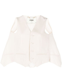 cut-out tailored cape Fendi elevates classic tailoring lines with this cape-style jacket, crafted from in Italy from virgin wool. Bold cut-outs at the shoulder lend a contemporary feel to the structured garment. Highlights - Cream white - Virgin wool - Cape design - Tailored cut - Cold-shoulder design - V-neck - Front button fastening - Two front welt pockets - Adjustable strap to the rear Made in Italy Composition Lining: Cupro 100% Outer: Virgin Wool 100% SIZE & FIT Model measurements Height 5 ft 10 in(1.77 m) Bust/Chest 29.92 in(76 cm) Hips 34.25 in(87 cm) Waist 23.62 in(60 cm) FittingInformation Designed for a relaxed fit, this piece allows for comfort and movement when worn The belt offers adjustability for fitted preferences Made from a midweight non-stretch fabric This piece fits true to size – take your usual size