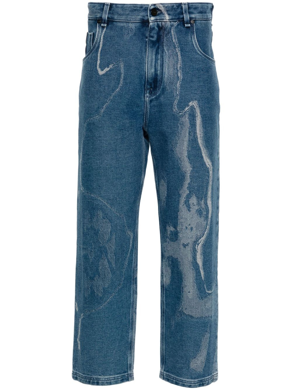 pattern-jacquard jeans Highlights - Medium blue - Cotton blend - Denim - Patterned jacquard - Belt loops - Classic five pockets - Logo patch to the front - Logo patch to the rear - Cropped - Front button and zip fastening Made in Italy Composition Calf Leather 100%, Cotton 99%, Polyester 1% SIZE & FIT Model measurements Height 6 ft 2 in(1.88 m) Bust/Chest 36.61 in(93 cm) Hips 35.82 in(91 cm) Waist 27.95 in(71 cm) FittingInformation Designed with a straight leg, these jeans allow for an unrestricted and comfortable fit over the leg Constructed from stretch denim, this piece offers a stretch fit with durability This piece fits true to size – take your usual size Washing instructions Machine Wash