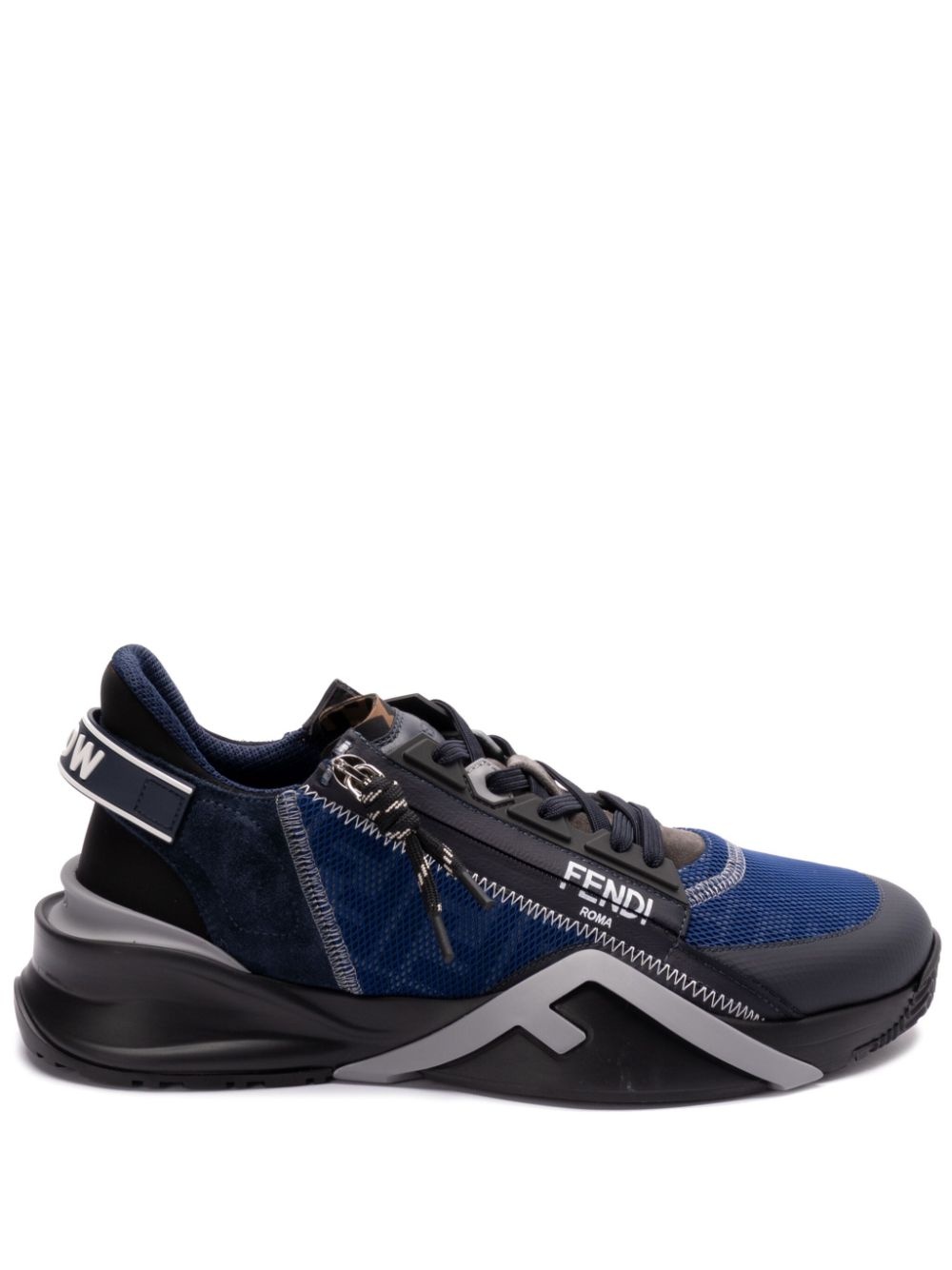 Fendi Flow sneakers Highlights - Blue - Front lace-up fastening - Side zip fastening - Pull-tab at the heel - Signature ff-pattern print Made in Italy Composition Outer: Calf Leather 100%, Polyamide 38%, Polyester 37%, Elastane 25% Lining: Recycled Polyester 100% Sole: Rubber 100%