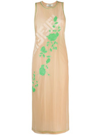Fendi Roses sleeveless midi dress Fendi boasts an eye-catching design with this midi dress. Rendered in beige with green hand-painted Fendi Roses embroidery, it features contrasting stitching and and a hook-and-eye closure at the back. Highlights - Beige - Ff-logo print - Round neck - Sleeveless - Long logo tie at the rear - Rear hook and eye fastening - Calf-length - Straight hem - Pull-on style Made in Italy Composition Polyester 100%, Polyamide 100% SIZE & FIT Model measurements Height 5 ft 10 in(1.78 m) Bust/Chest 30.7 in(78 cm) Hips 34.64 in(88 cm) Waist 23.22 in(59 cm) FittingInformation Designed for a slim fit that sits just away from the body offering a close yet comfortable fit Made from a lightweight stretch fabric, this piece offers elasticity and flexibility when worn This piece fits true to size – take your usual size