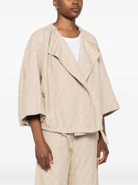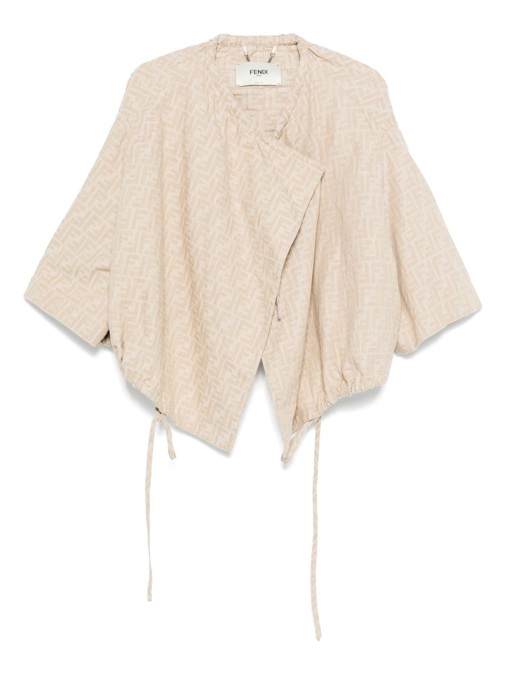FF-jacquard drawstring jacket Highlights - Beige - Signature ff pattern - Drawstring hem - Short sleeves - Asymmetric hem Made in Italy Composition Cotton 74%, Linen/Flax 26% SIZE & FIT Model measurements Height 5 ft 11 in(1.8 m) Bust/Chest 31.49 in(80 cm) Hips 36.61 in(93 cm) Waist 24.4 in(62 cm) Washing instructions Machine Wash