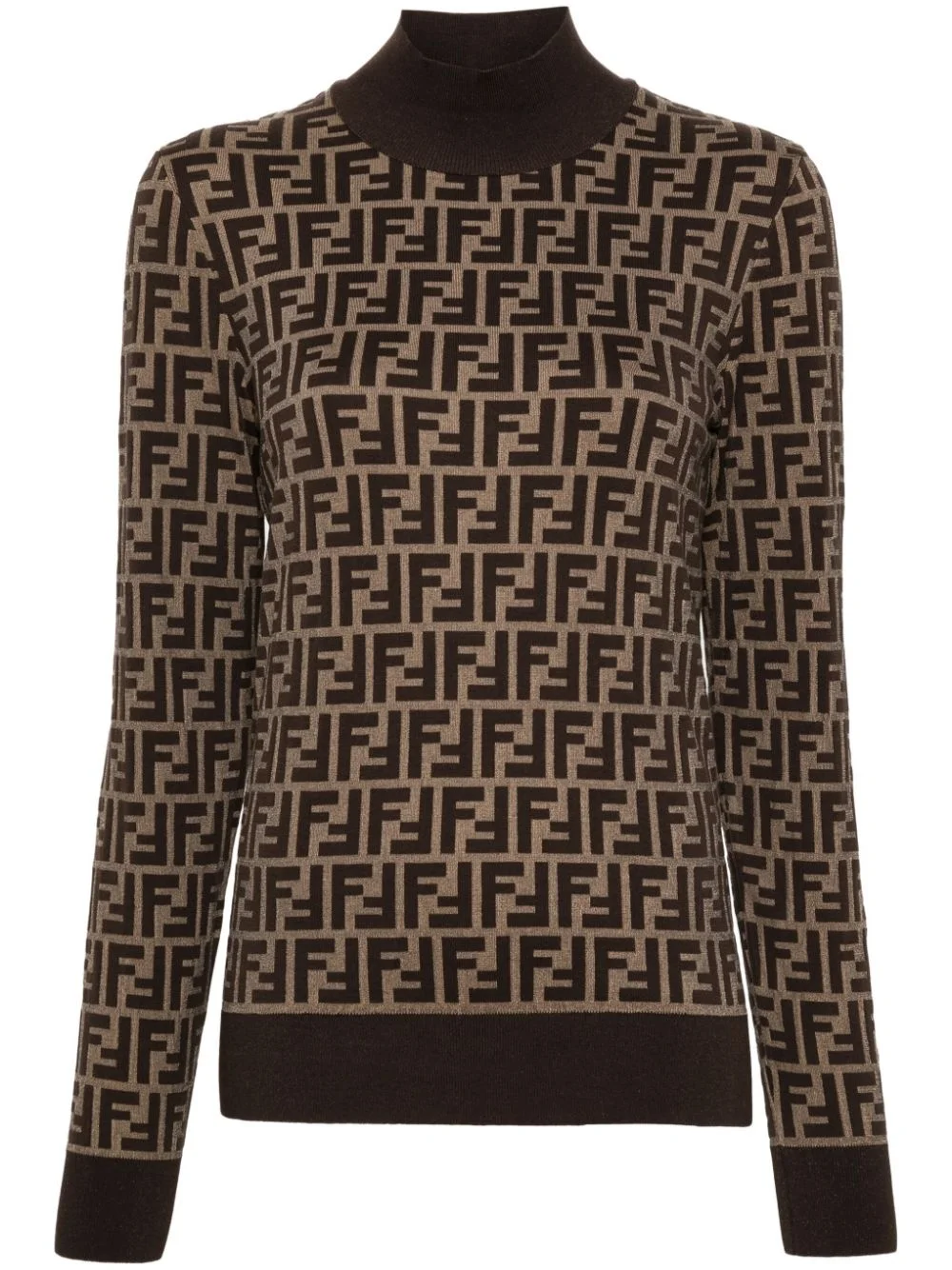 FF-jacquard sweater Highlights - Tobacco brown - Cotton blend - Ff patterned jacquard - Mock neck - Long sleeves - Ribbed cuffs and hem - Straight hem Made in Italy Composition Cotton 80%, Polyamide 16%, Elastane 4% Washing instructions Hand Wash