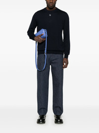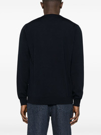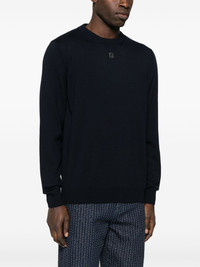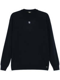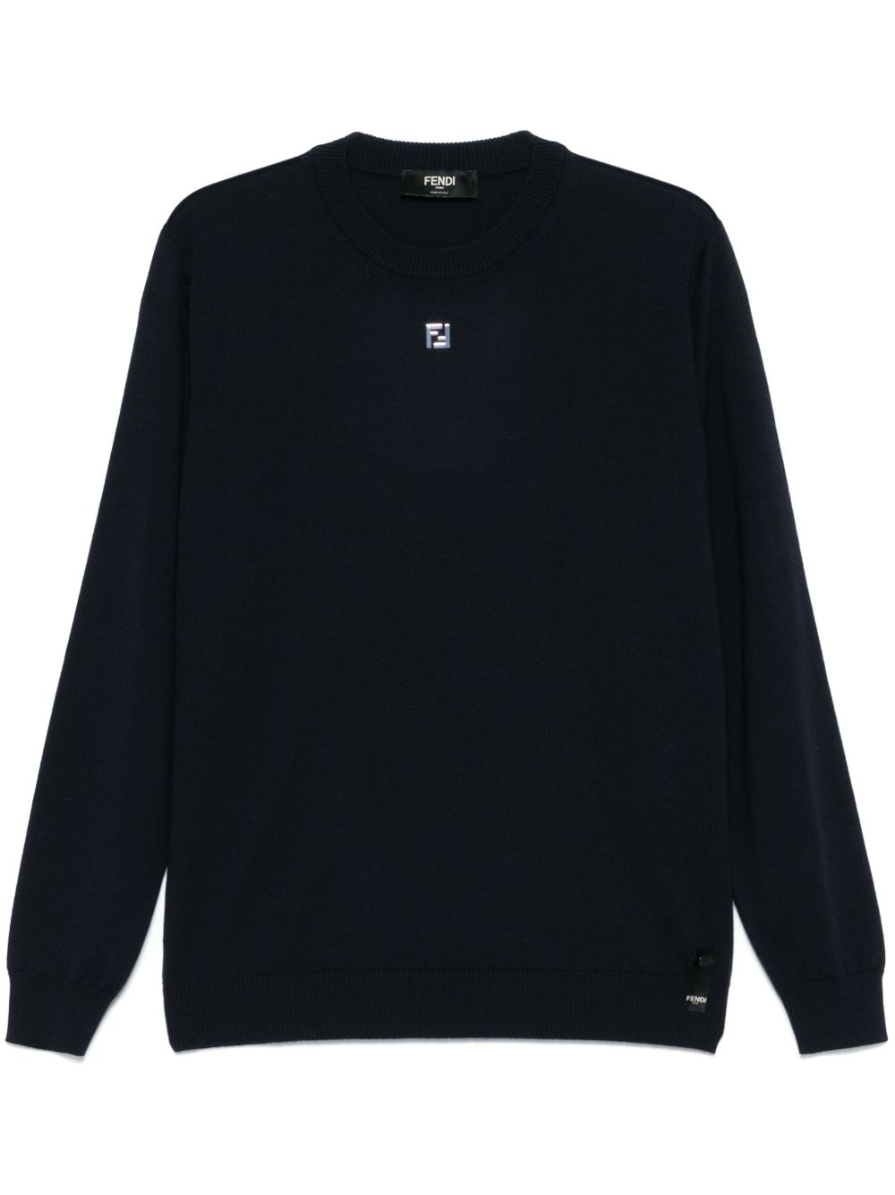 FF-logo plaque sweater Highlights - Midnight blue - Crew neck - Long sleeves - Ribbed trim Made in Italy Composition Virgin Wool 98%, Elastane 2% SIZE & FIT Model measurements Height 6 ft 0 in(1.84 m) Bust/Chest 35.82 in(91 cm) Hips 37 in(94 cm) Waist 28.34 in(72 cm) FittingInformation Designed for a regular fit, offering a comfortable loose fit throughout the body The ribbed hem offers a close, comfortable fit Made with a lightweight knit, this piece offers some stretch