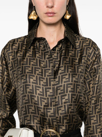 FF-logo print silk shirt Highlights - Tobacco brown/black - Silk - Satin finish - All-over ff-logo print - Classic collar - Long sleeves with buttoned cuffs - Fabric-covered buttons - Curved hem - Concealed front button fastening Made in Italy Composition Silk 100% SIZE & FIT Model measurements Height 5 ft 10 in(1.78 m) Bust/Chest 33.46 in(85 cm) Hips 36.22 in(92 cm) Waist 23.22 in(59 cm) FittingInformation Designed to be unstructured, offering a loose fit throughout Made from a lightweight non-stretch fabric This piece fits true to size – take your usual size