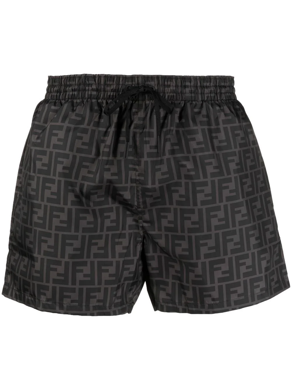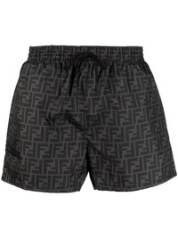 FF-logo print swim shorts FF-logo print swim shorts from FENDI featuring black, dark grey, drawstring fastening waist, FF-logo print and straight leg. Be mindful to try on swimwear over your own garments.. Made in Italy Composition Lining: Polyamide 82%, Spandex/Elastane 18% Outer: Polyester 100% Washing instructions Hand Wash