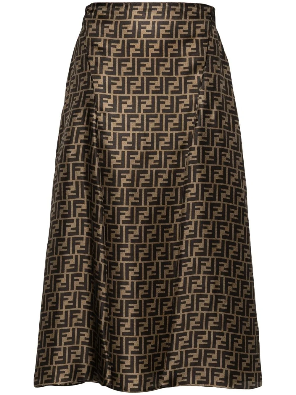 FF-pattern print midi skirt Highlights - Tobacco brown - Silk - Twill weave - Signature ff-pattern print - Concealed rear hook and zip fastening - High waist - Pleat detailing - Unlined - A-line - Flared hem - Mid-length Made in Italy Composition Silk 100% SIZE & FIT Model measurements Height 5 ft 10 in(1.78 m) Bust/Chest 32.67 in(83 cm) Hips 35.43 in(90 cm) Waist 23.22 in(59 cm) FittingInformation This midi-length skirt is intended to be worn high on the waist Made from a lightweight non-stretch fabric This piece fits true to size – take your usual size Washing instructions Dry Clean Only