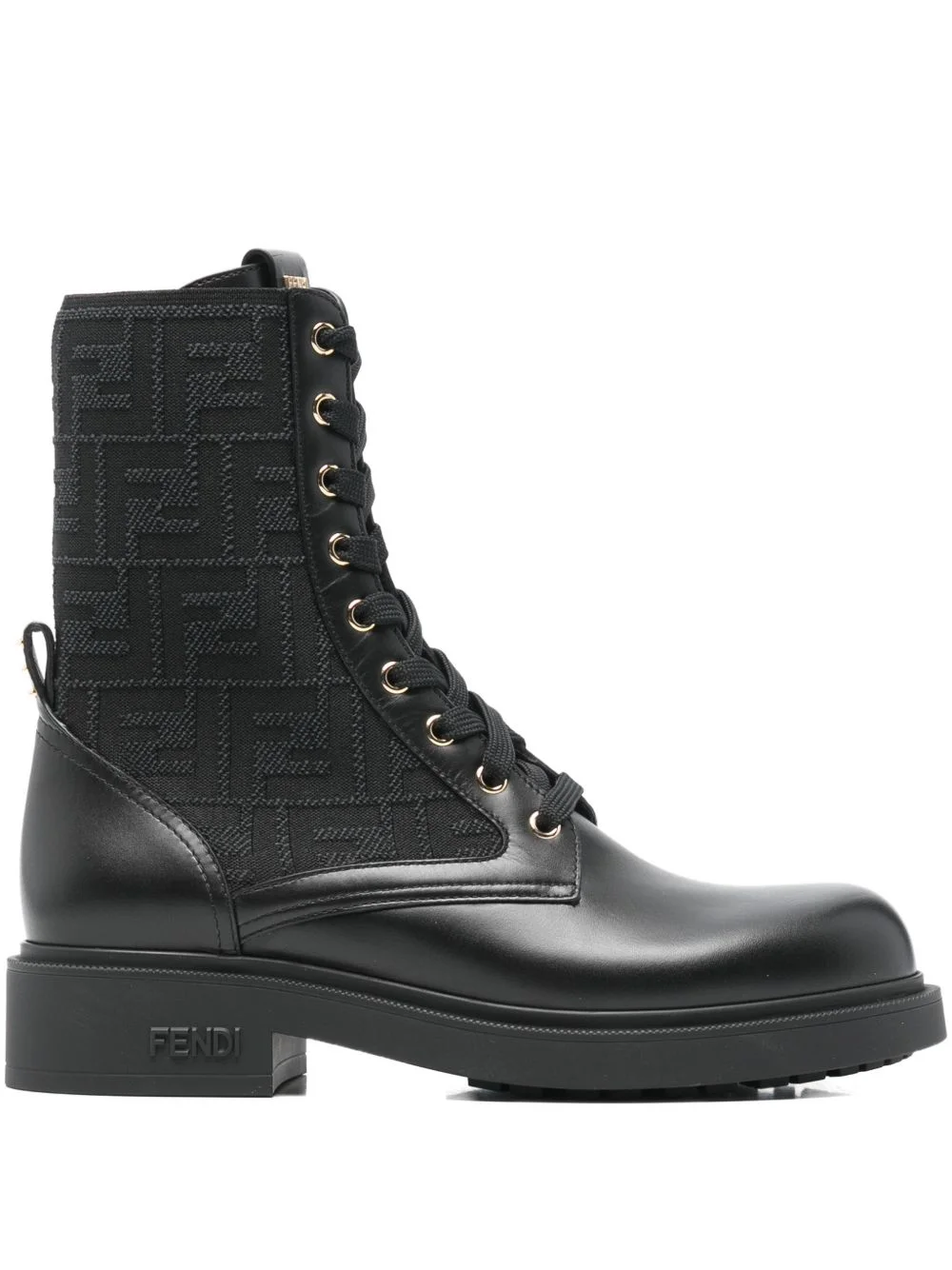 Filo logo stretch ankle boot Highlights - Black - Logo pattern - Lace-up fastening - Gold-tone eyelets - Pull-tab at the heel Made In Italy Composition Outer: Calf Leather 100%, Polyester 100%, Elastane 100% Lining: Calf Leather 100% Sole: Rubber 100% SIZE & FIT Measurement HEEL 1.37 in(3.5 cm)
