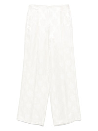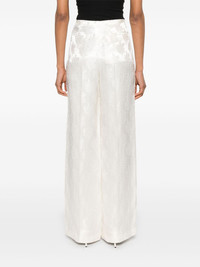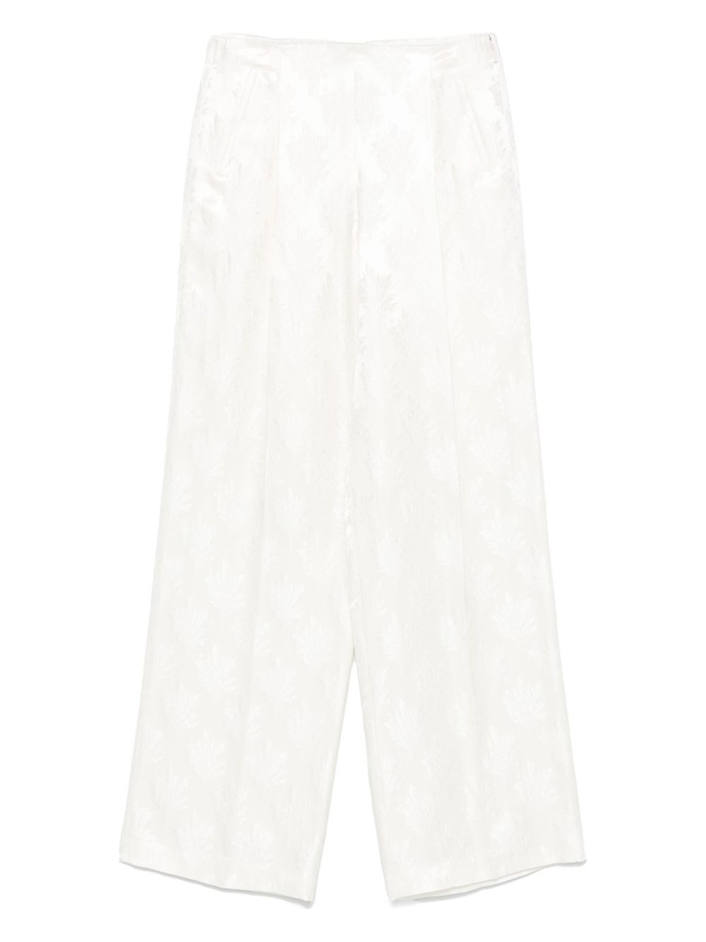 floral-jacquard trousers Highlights - White - Concealed side hook and zip fastening - Two side welt pockets - Rear welt pocket - Pleat detailing Made in Italy Composition Lining: Silk 100% Outer: Silk 51%, Viscose 49% SIZE & FIT Model measurements Height 5 ft 10 in(1.77 m) Bust/Chest 33.07 in(84 cm) Hips 37 in(94 cm) Waist 24.8 in(63 cm) FittingInformation Designed with a wide-leg cut, these trousers allow for a close fit at the waist and offer a loose and roomy fit over the leg Made from a lightweight non-stretch fabric