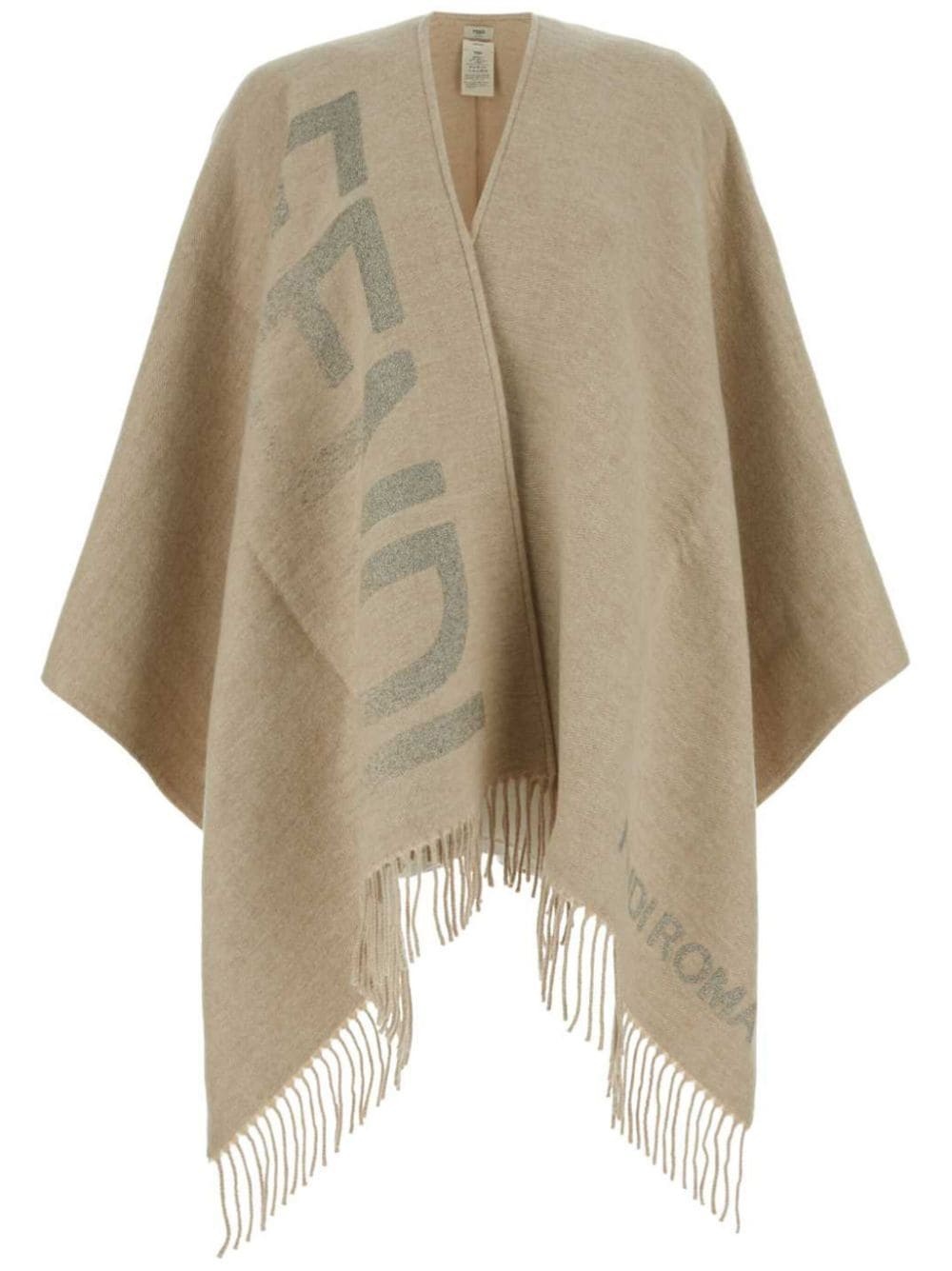 fringed detailed poncho Highlights - Beige - Virgin wool blend - Fringed edge - Logo print to the front - High-low hem Made in Italy Composition Virgin Wool 60%, Cashmere 23%, Viscose 13%, Metallic Fibre 4%