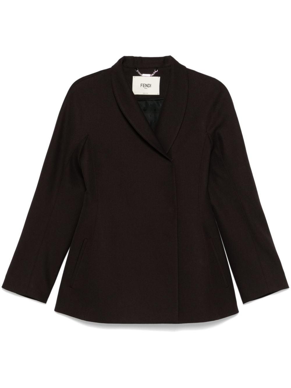 grain de poudre blazer Highlights - Cedar brown - Virgin wool - Grain de poudre - High neck - Double-breasted hook and eye fastening - Wrap design - Long sleeves - Fitted waistline - Logo-jacquard lining - Straight hem Made in Italy Composition Outer: Virgin Wool 100% Lining: Viscose 100% SIZE & FIT Model measurements Height 5 ft 10 in(1.77 m) Bust/Chest 33.07 in(84 cm) Hips 37 in(94 cm) Waist 24.8 in(63 cm) FittingInformation Designed for a slim fit that sits just away from the body offering a close yet comfortable fit Made from a midweight non-stretch fabric Washing instructions Dry Clean Only