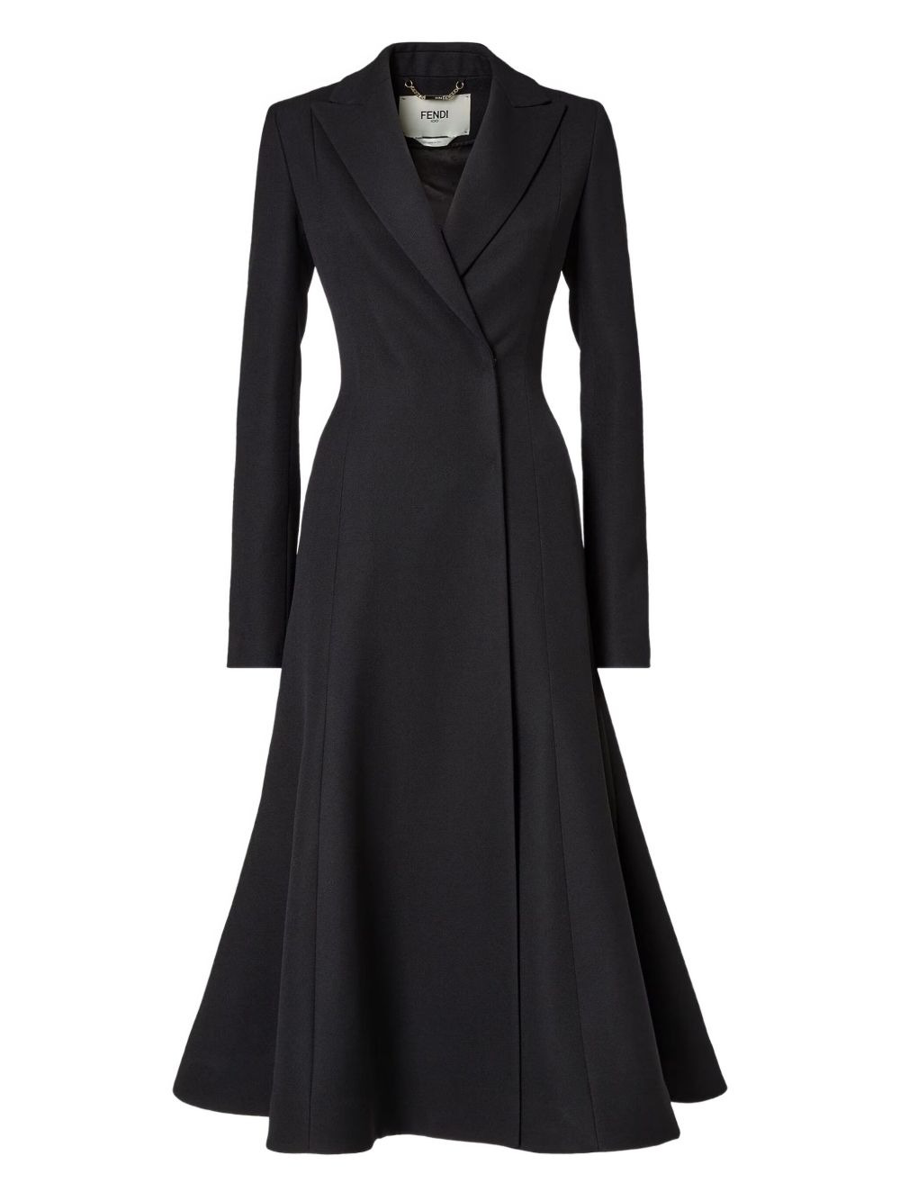 grain-de-poudre wool coat Highlights - Black - Double-breasted closure - Long sleeves - Flared hem - Hook fastening - Ff jacquard lining Made in Italy Composition Outer: Virgin Wool 100% Lining: Viscose 100% Washing instructions Read Manufacturer Guidelines