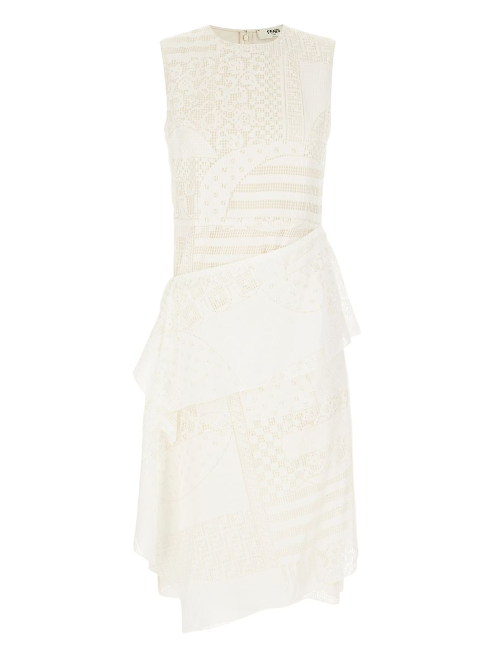 lace-paneled midi dress Highlights - Off-white - Lace panels - Sleeveless - Round neck - Asymmetrical hem - Ruffled overlay Imported Composition Outer: Viscose 58%, Silk 42% Lining: Silk 100% Washing instructions Read Manufacturer Guidelines