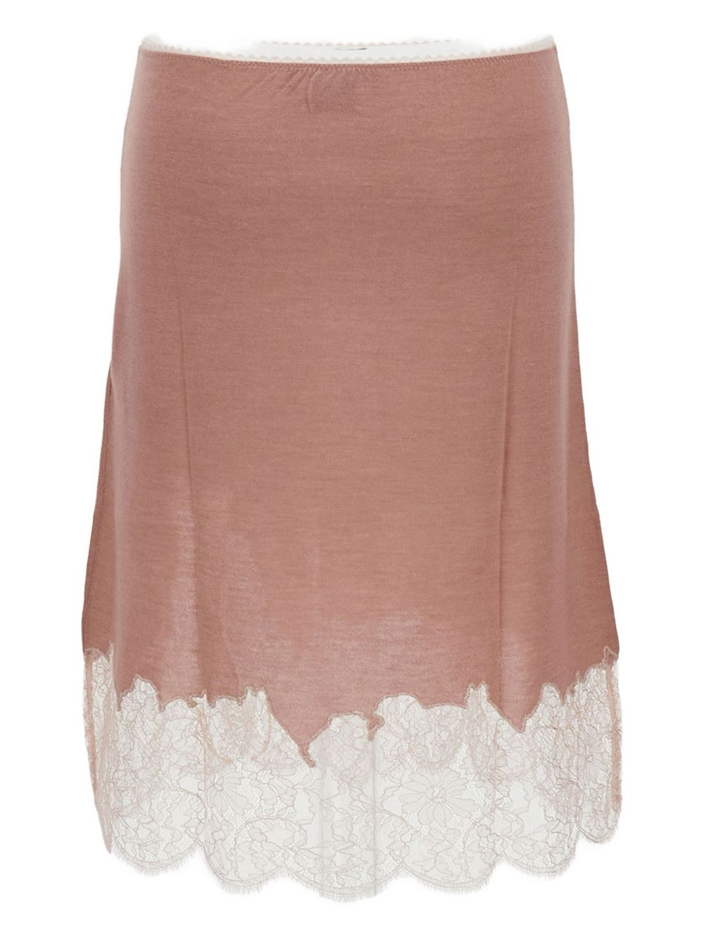 lace-trimmed wool skirt Highlights - Rose pink - Wool construction - Lace trim - Asymmetric hem - Scalloped lace edge - Fitted waist Made in Italy Composition Viscose 51%, Polyamide 49%