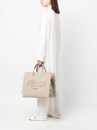 large FF jacquard fringed tote bag Decorated with the iconic FF monogram jacquard, this tote bag by Fendi (VIP) comes in a beige hue and boasts the label's tonal lettering at the front. Presented in a large, structured silhouette, it is accented with fringed edges and benefits from a spacious main compartment. Highlights - Beige - Calf leather - Monogram jacquard - Signature embossed ff pattern - Fringed edge - Logo lettering - Two top handles - Open top - Main compartment - Internal zip-fastening pocket - Adjustable detachable shoulder strap Made in Italy Composition Outer: Fabric 100%, Calf Leather 100% SIZE & FIT Model measurements Height 5 ft 10 in(1.78 m) Bust/Chest 33.46 in(85 cm) Hips 36.22 in(92 cm) Waist 23.22 in(59 cm) Measurement DEPTH 7.87 in(20 cm) HANDLE 5.11 in(13 cm) HEIGHT 12.99 in(33 cm) STRAP 18.5 in(47 cm) WIDTH 16.14 in(41 cm)