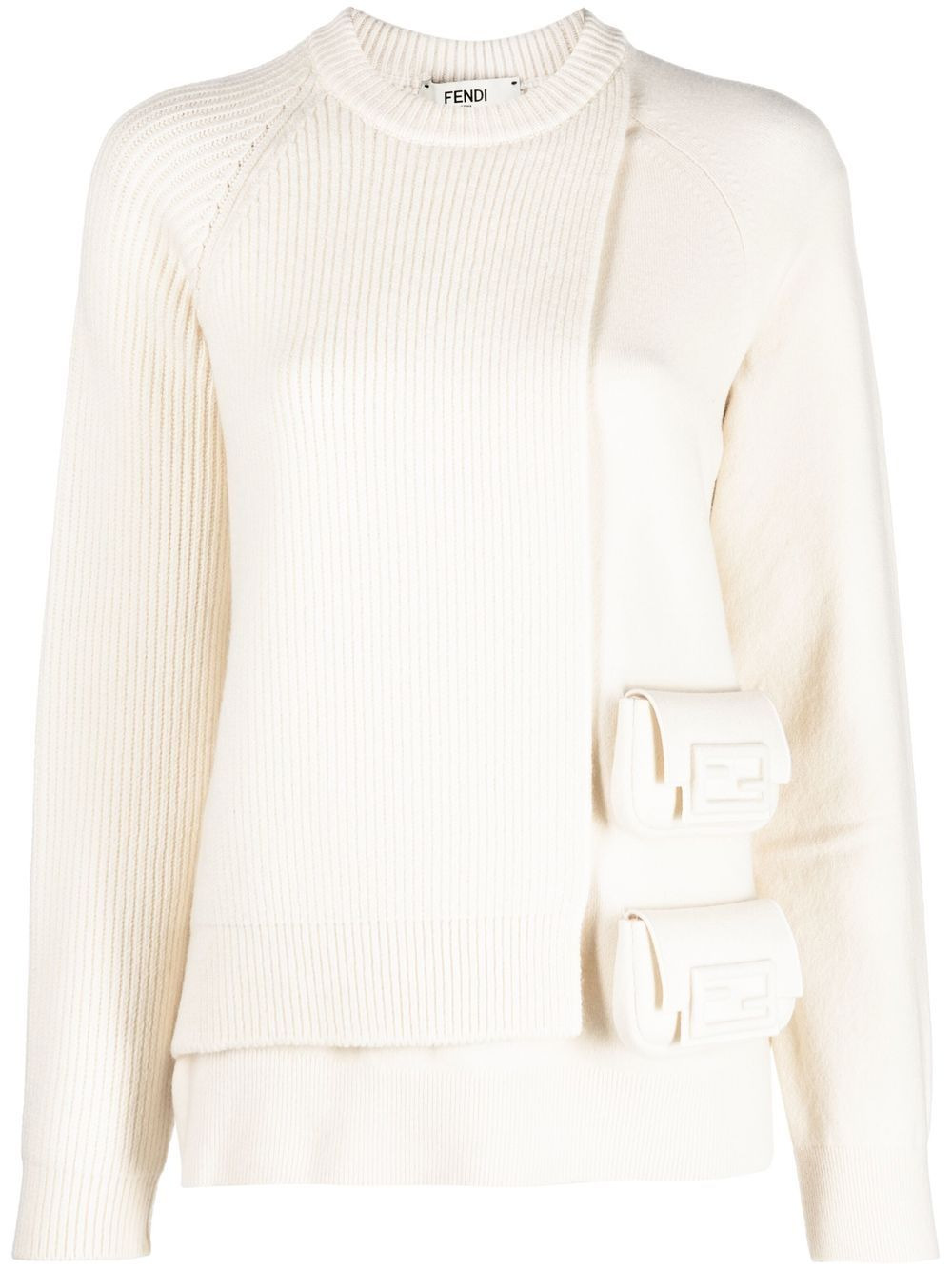 layered utility pocket jumper Fendi showcases its inventive aesthetic in the design of this jumper. Spun from cashmere and wool, it features a layered construction with a ribbed panel and two functional Baguette bag-inspired pockets in the same neutral beige hue. Made in Italy Composition Wool 70%, Cashmere 30% SIZE & FIT Model measurements Height 5 ft 10 in(1.79 m) Bust/Chest 31.1 in(79 cm) Hips 35.03 in(89 cm) Waist 24.01 in(61 cm) FittingInformation This piece fits true to size. We recommend you get your regular size Cut for a loose fit Made with a mid-weight fabric Washing instructions Dry Clean Only