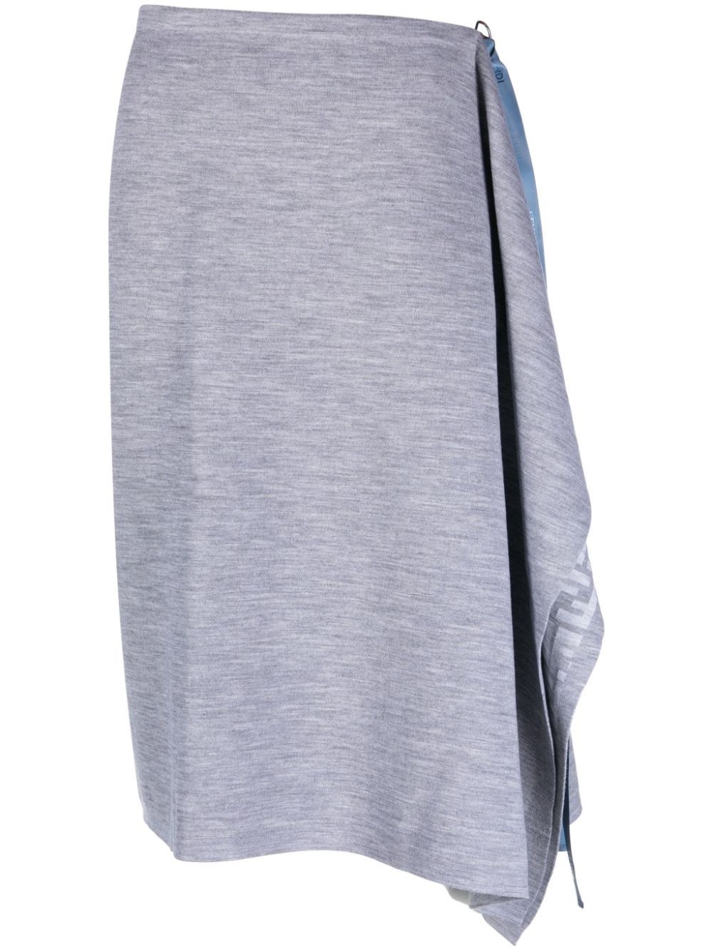 asymmetric knitted wrap skirt Highlights - Ash grey - Wool blend - Melange effect - Signature ff-pattern print - Reverse logo embroidery - D-ring buckle fastening - Draped detailing - Mid-rise - Asymmetric hem - Knee-length - Wraparound style Made in Italy Composition Wool 85%, Polyamide 14%, Polyurethane 1% SIZE & FIT Model measurements Height 5 ft 10 in(1.78 m) Bust/Chest 31.49 in(80 cm) Hips 35.03 in(89 cm) Waist 23.62 in(60 cm) FittingInformation This piece fits true to size. We recommend you get your regular size Designed to be fitted at the waist, loose over the leg Made with a mid-weight fabric