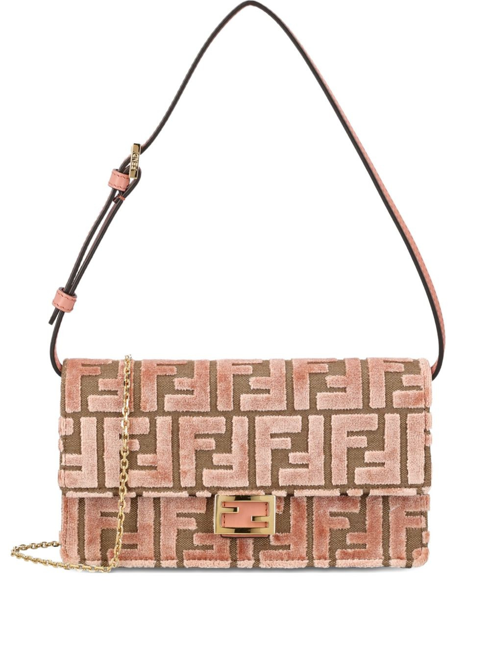 medium Baguette jacquard-velvet shoulder bag Highlights - Pink - Jacquard velvet - Ff buckle closure - Removable chain shoulder strap Made in Italy Composition Outer: Velvet 100%, Polyester 40%, Cotton 35%, Viscose 25% Lining: Calf Leather 100% SIZE & FIT Measurement DEPTH 1.96 in(5 cm) HEIGHT 4.72 in(12 cm) WIDTH 8.26 in(21 cm)