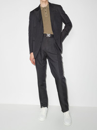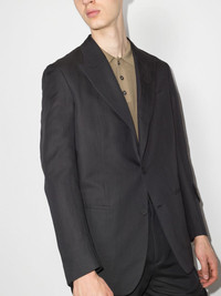 peak-lapel single-breasted blazer In a tailored silhouette, this grey blazer is defined by its timeless elements, such as the peak lapels. In a tonal design, the branding stays within the understated theme, appearing embroidered on the left sleeve. Highlights - Grey - Linen-cotton-lyocell blend - Peak lapels - Front button fastening - Long sleeves - Buttoned cuffs - Chest welt pocket - Two side welt pockets - Central rear vent Made in Italy Composition Outer: Linen/Flax 41%, Lyocell 38%, Cotton 21% Lining: Cupro 100% SIZE & FIT FittingInformation This piece fits true to size. We recommend you get your regular size Cut for a loose fit Made with a mid-weight non-stretch fabric