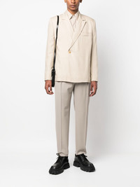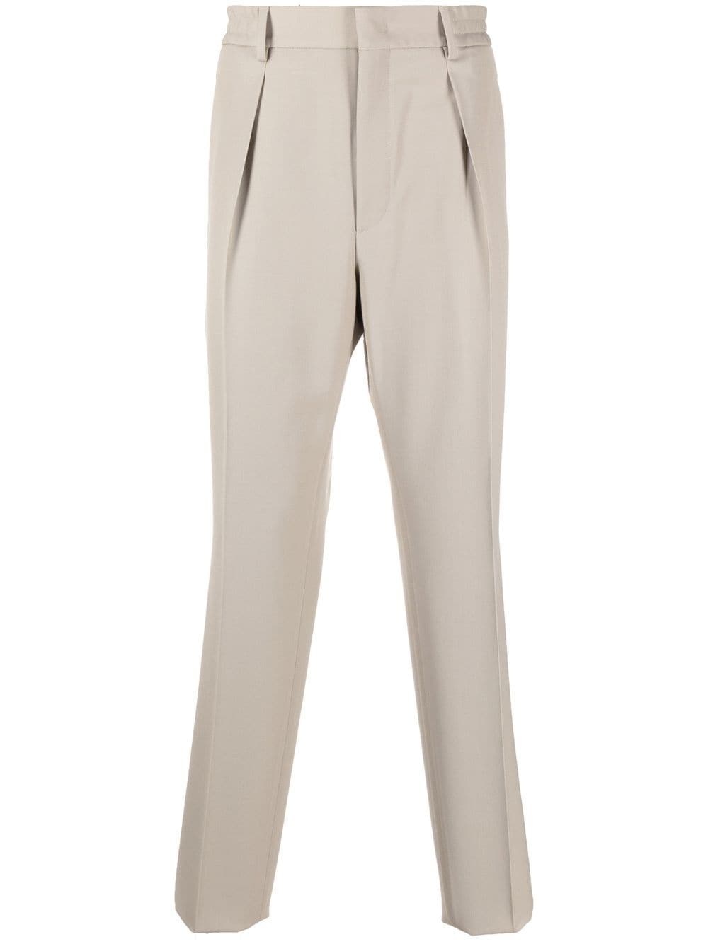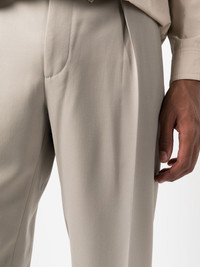 pleated tailored trousers rock grey virgin wool blend pleat detailing concealed front fastening two diagonal pockets to the sides two rear welt pockets tailored cut Made in Italy Composition Outer: Polyester 55%, Virgin Wool 45% Lining: Viscose 100% SIZE & FIT Model measurements Height 6 ft 2 in(1.87 m) Bust/Chest 37 in(94 cm) Hips 33.85 in(86 cm) Waist 27.95 in(71 cm) FittingInformation This piece fits true to size. We recommend you get your regular size Cut for a slim fit Made with a mid-weight non-stretch fabric