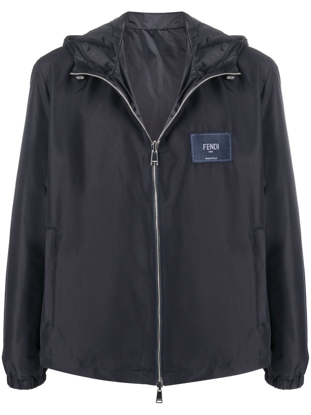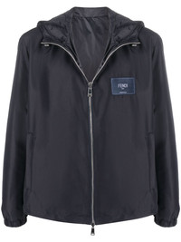 reversible logo-patch hooded jacket Crafted with a versatile reversible design, this Fendi jacket in night-blue has a classic slim cut and a drawstring hood. A simple logo patch is embroidered on the chest, making for a sophisticated- branded accent. Made in Italy Composition Lining: Polyester 100% Outer: Polyester 100% SIZE & FIT FittingInformation This piece fits true to size. We recommend you get your regular size Cut for a loose fit Made with a mid-weight non-stretch fabric