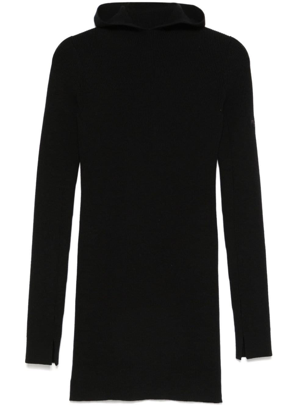 ribbed-knit mini dress Highlights - Black - Wool blend - Ribbed knit - Slouchy hood - Mock neck - Long slit sleeves - Embroidered logo at the sleeve - Straight hem - Above-knee length Made in Italy Composition Wool 58%, Silk 25%, Polyamide 15%, Elastane 2% SIZE & FIT Model measurements Height 5 ft 10 in(1.77 m) Bust/Chest 28.74 in(73 cm) Hips 35.03 in(89 cm) Waist 23.62 in(60 cm) FittingInformation Designed for a close fit throughout Made with a midweight knit, this piece offers some stretch