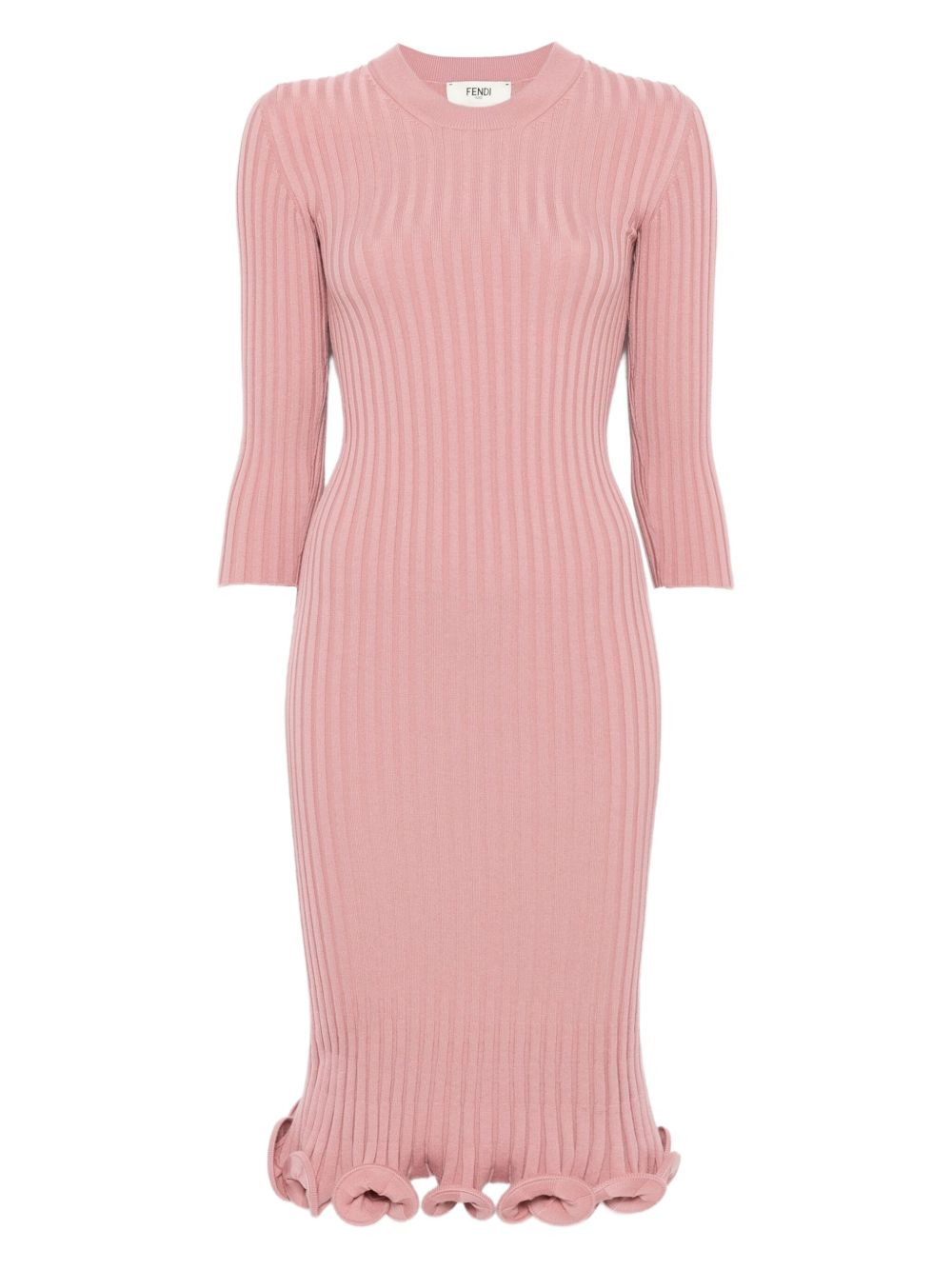 ribbed-knit ruffled midi dress Highlights - Pink - Ribbed knit - Three-quarter sleeves - Round neck - Ruffled hem Made in Italy Composition Wool 95%, Polyamide 4%, Elastane 1% SIZE & FIT Model measurements Height 5 ft 11 in(1.8 m) Bust/Chest 32.67 in(83 cm) Hips 36.22 in(92 cm) Waist 24.4 in(62 cm) Washing instructions Dry Clean Only