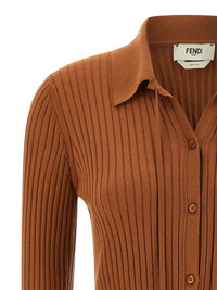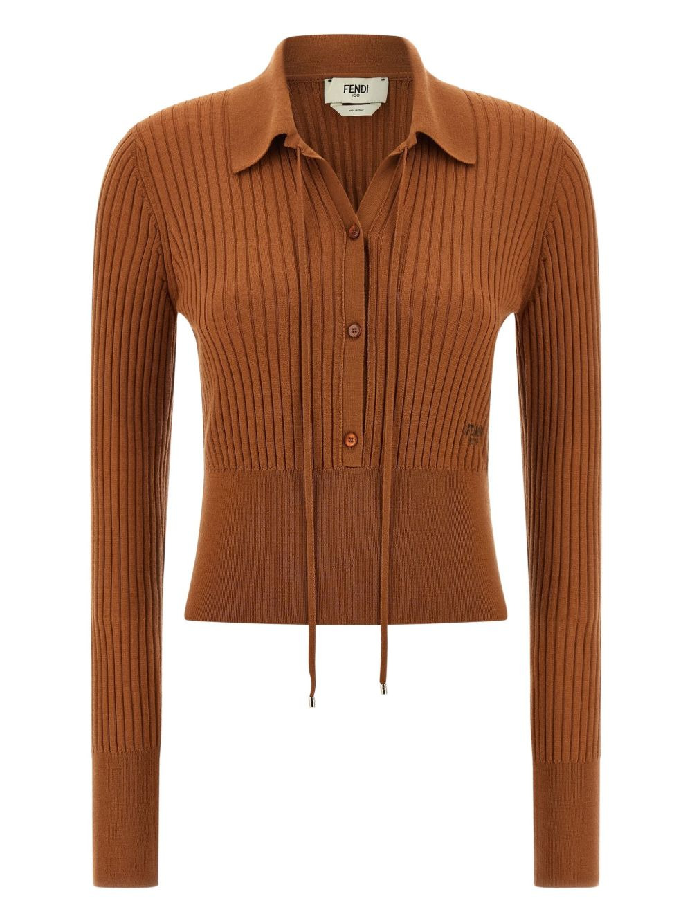 ribbed logo-intarsia knitwear Highlights - Brown - Ribbed knit - Polo collar - V-neck - Button fastening Made in Italy Composition Wool 100%, Mother of Pearl 100% Washing instructions Read Manufacturer Guidelines