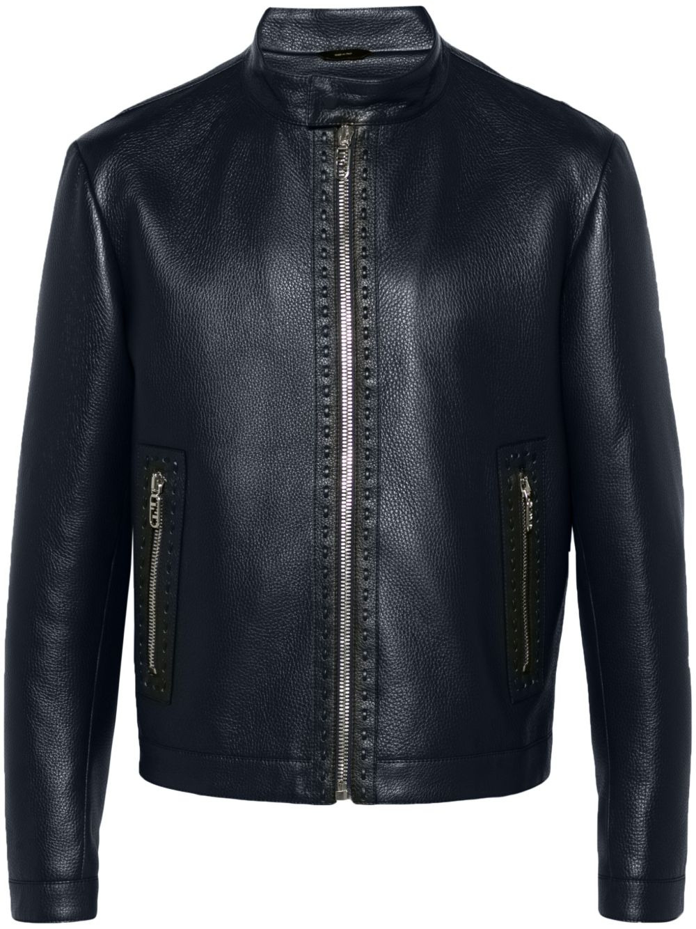Selleria leather jacket Highlights - Midnight blue - Lambskin - Grained texture - Selleria stitching detail - Front zip fastening - Band collar - Long sleeves with cuff zips - Two side zip-fastening pockets - Ff patch to the back - Waist tabs - Two internal slip pockets - Full logo-jacquard lining - Straight hem Made in Italy Composition Outer: Sheepskin 100% Lining: Cupro 100% SIZE & FIT Model measurements Height 6 ft 2 in(1.89 m) Bust/Chest 39.76 in(101 cm) Hips 37.4 in(95 cm) Waist 29.92 in(76 cm) FittingInformation Designed for a slim fit, offering a comfortable fit that sits just away from the body The adjustable tabs allow for fitted preferences Soft leather has a supple and smooth construction offering some flexibility Washing instructions Specialist Cleaning