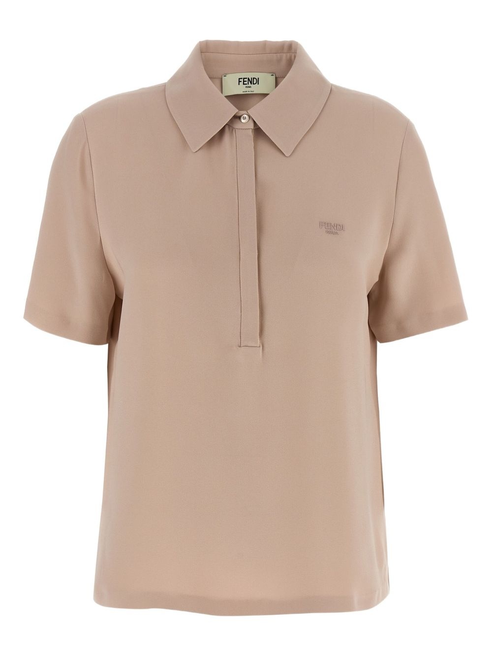 silk polo shirt Highlights - Pink - Front button placket - Short sleeves - Embroidered logo at the chest - Straight hem Made in Italy Composition Silk 100%, Mother of Pearl 100% Washing instructions Read Manufacturer Guidelines