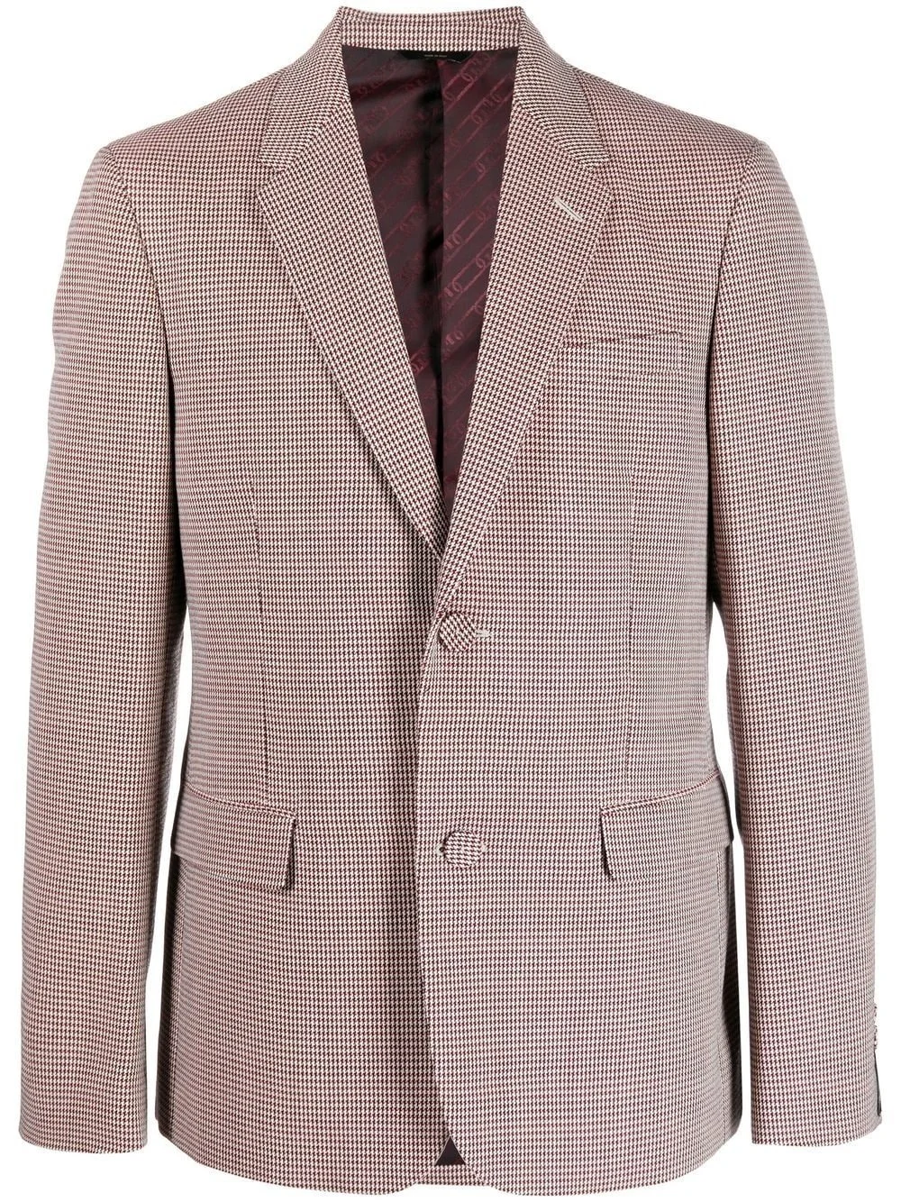 single-breasted houndstooth blazer white/red virgin wool blend houndstooth pattern logo-print lining notched lapels chest welt pocket two front flap pockets front button fastening long sleeves buttoned cuffs central rear vent Made in Italy Composition Outer: Virgin Wool 97%, Polyester 3% Lining: Cupro 100% SIZE & FIT Model measurements Height 6 ft 2 in(1.88 m) Bust/Chest 36.61 in(93 cm) Hips 37.79 in(96 cm) Waist 28.74 in(73 cm) FittingInformation This piece fits true to size. We recommend you get your regular size Cut for a loose fit Made with a mid-weight non-stretch fabric