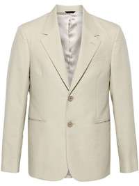 wool blazer Highlights - Light beige - Virgin wool - Interlock twill weave - Front button fastening - Notched lapels - Long sleeves - Buttoned cuffs - Chest welt pocket - Dart detailing - Two front jetted pockets - American rear vent - Satin lining - Shoulder pads - Internal slip pocket - Straight hem Made in Italy Composition Outer: Virgin Wool 100% Lining: Viscose 100% SIZE & FIT Model measurements Height 6 ft 2 in(1.87 m) Bust/Chest 36.41 in(92.5 cm) Hips 37 in(94 cm) Waist 29.52 in(75 cm) FittingInformation The vented hem offers movement at the rear Made from a midweight non-stretch fabric This piece fits true to size – take your usual size