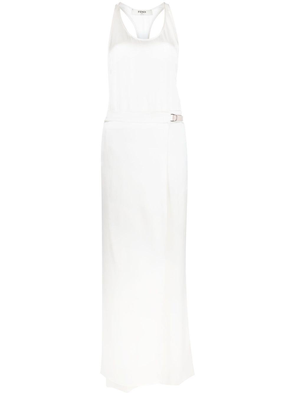 sleeveless silk satin jumpsuit The lustrous silk satin construction of this Fendi jumpsuit accentuates its fluid silhouette. Presented in a timeless ivory white shade, the sleeveless design is complemented by an optional panel that belts at the waist, creating an asymmetrical layered effect. Highlights - Ivory white - Silk satin - Layered design - Scoop neck - Racerback - Sleeveless - Pressed crease - Flared hem Made in Italy Composition Silk 100% SIZE & FIT Model measurements Height 5 ft 10 in(1.78 m) Bust/Chest 31.49 in(80 cm) Hips 36.22 in(92 cm) Waist 25.59 in(65 cm) FittingInformation Designed for a loose fit at the chest and waist with a close fit on the hips The belt offers adjustability for fitted preferences Made from a lightweight non-stretch fabric This piece fits true to size – take your usual size