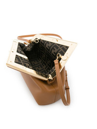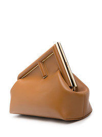small Fendi First clutch bag The Fendi First clutch bag gets its attention-grabbing look from the asymmetric silhouette. This unconventional design is provided by the signature F clasp fastening, which stands out from the leather construction with a gold-tone trim. Highlights - Cognac brown - Calf leather - Smooth grain - Asymmetric design - Metal f clasp fastening - Adjustable detachable shoulder strap - Main compartment - Internal logo patch - Ff motif lining - Gold-tone hardware - This piece comes complete with a protective dust bag. Made in Italy Composition Outer: Calf Leather 100% SIZE & FIT Model measurements Height 5 ft 11 in(1.8 m) Bust/Chest 30.7 in(78 cm) Hips 35.03 in(89 cm) Waist 24.4 in(62 cm) Measurement DEPTH 3.54 in(9 cm) HEIGHT 6.88 in(17.5 cm) STRAP 20.47 in(52 cm) WIDTH 9.84 in(25 cm)