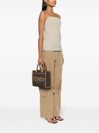 small Sunshine tote bag Highlights - Camel brown/cedar brown - Jacquard ff motif - Leather trim - Logo lettering - Two flat top handles - Detachable shoulder strap - Main compartment - Debossed internal logo - Internal patch pocket - Suede lining - Gold-tone hardware - Magnetic fastening Made in Italy Composition Outer: Fabric 100%, Calf Leather 100% SIZE & FIT Measurement DEPTH 3.93 in(10 cm) HANDLE 4.72 in(12 cm) HEIGHT 8.66 in(22 cm) STRAP 43.3 in(110 cm) WIDTH 9.84 in(25 cm)