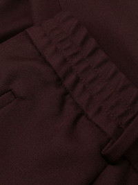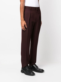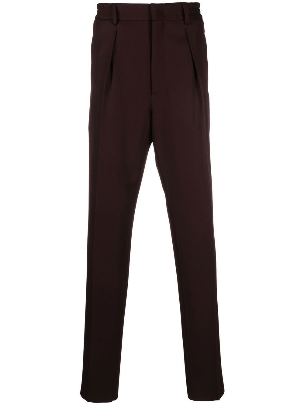 straight-leg trousers burgundy virgin wool blend elasticated waistband straight leg Made in Italy Composition Virgin Wool 59%, Polyester 41% SIZE & FIT Model measurements Height 6 ft 2 in(1.89 m) Bust/Chest 35.03 in(89 cm) Hips 38.18 in(97 cm) Waist 29.92 in(76 cm) FittingInformation This piece fits true to size. We recommend you get your regular size Cut for a slim fit Made with a mid-weight non-stretch fabric