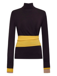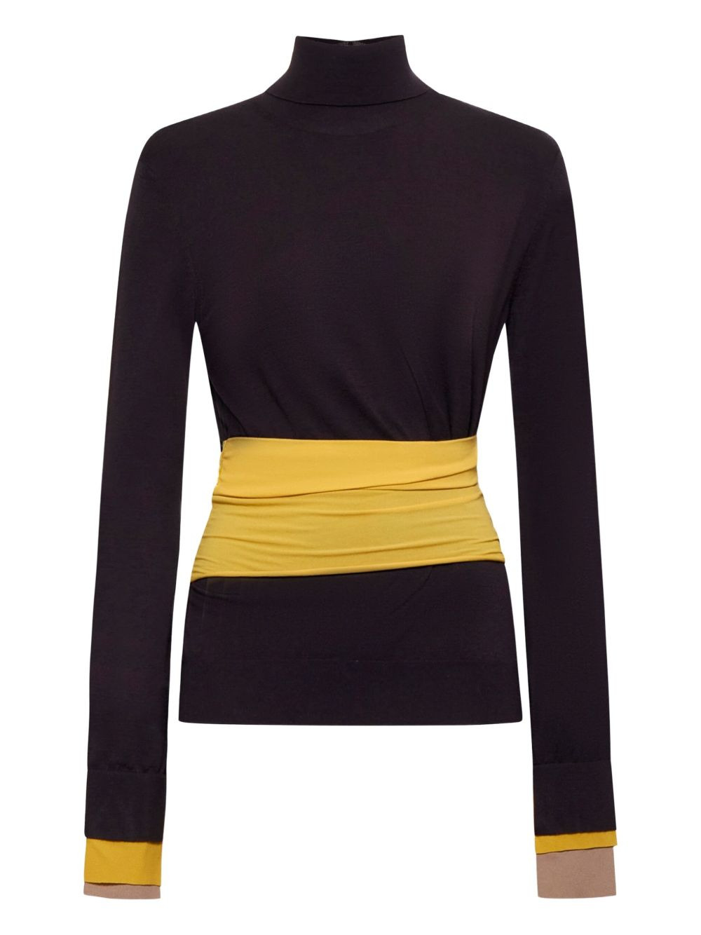 turtleneck waistband-detail sweater Highlights - Aubergine - Yellow waistband - Side buttons - Multi-layered cuffs - Trompe-l'oeil effect - Intarsia logo - Ribbed edges Made in Italy Composition Virgin Wool 100% Washing instructions Read Manufacturer Guidelines