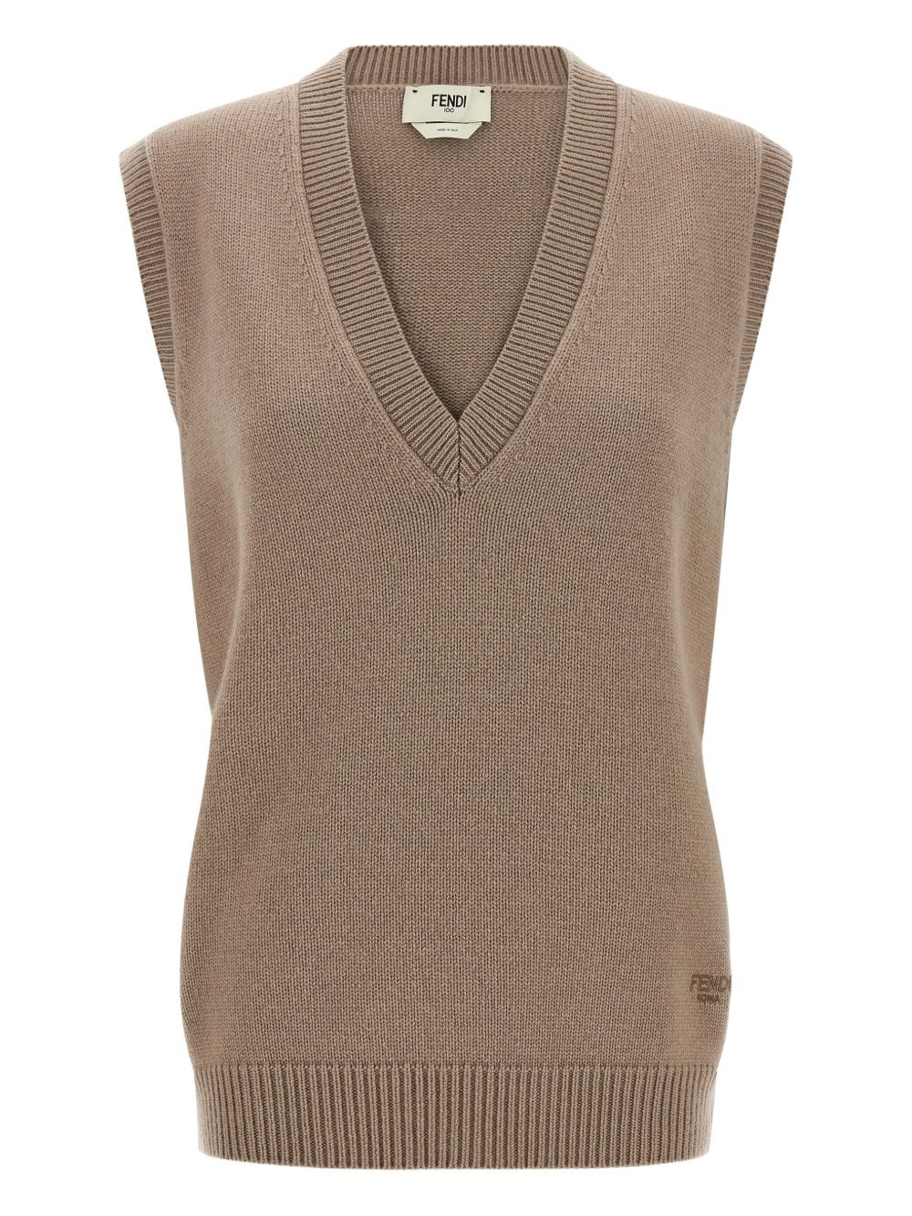 V-neck cashmere tank top Highlights - Beige - V-neck - Ribbed elastic insert at the back - Logo embroidery - Sleeveless - Ribbed hem Made in Italy Composition Cashmere 100% Washing instructions Read Manufacturer Guidelines