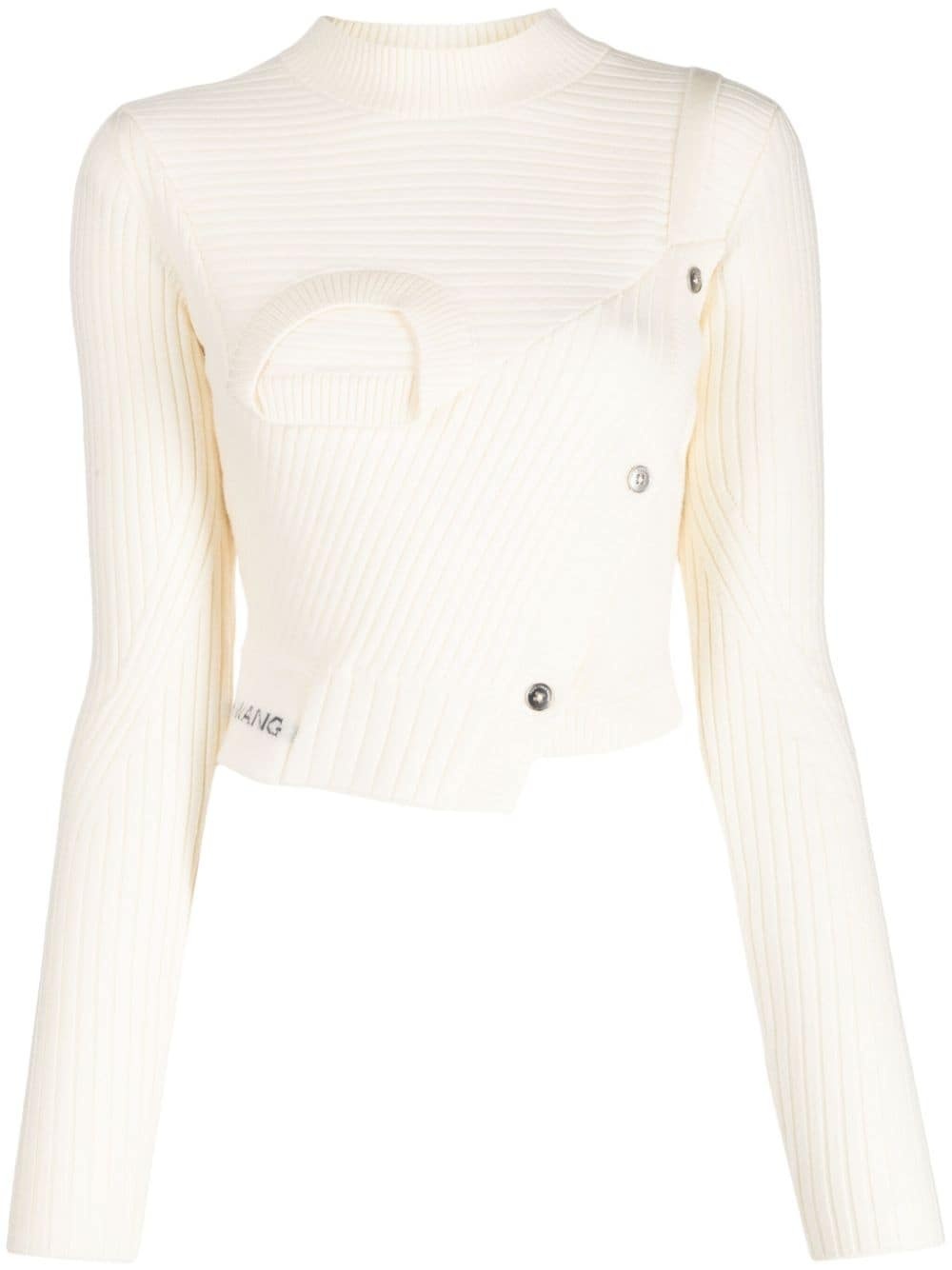 asymmetric ribbed-knit jumper Highlights - Cream white - Wool blend - Ribbed knit - Asymmetric design - Jacquard logo motif - Crew neck - Side button fastening - Long sleeves - Asymmetric hem Imported Composition Lambs Wool 94%, Polyamide 5%, Spandex/Elastane 1% Washing instructions Specialist Cleaning