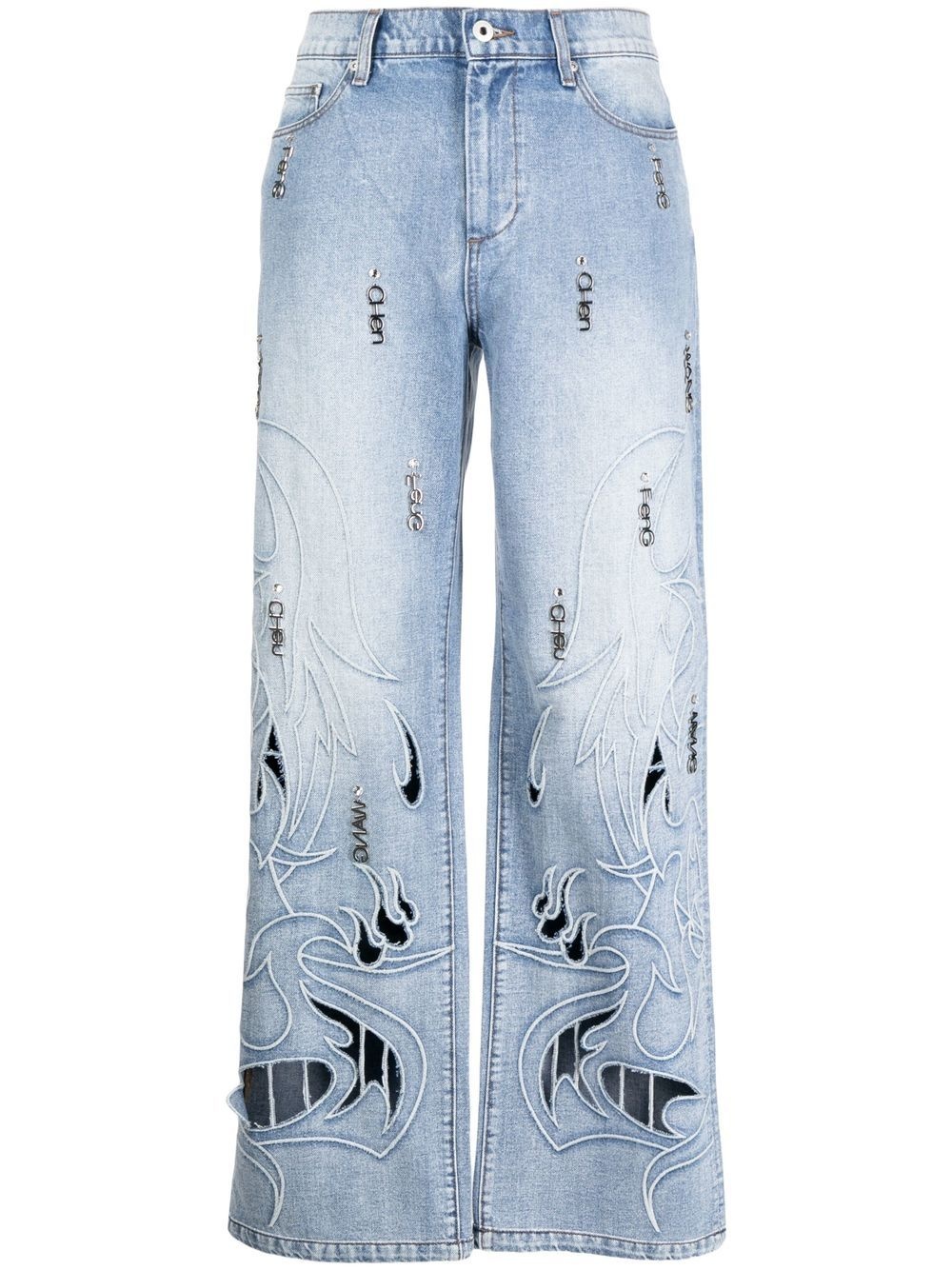 Phoenix cut-out jeans medium blue cotton straight leg cut-out detailing logo charm embroidered design belt loops front button and zip fastening classic five pockets Imported Composition Body: Cotton 100% SIZE & FIT Model measurements Height 6 ft 2 in(1.87 m) Bust/Chest 36.22 in(92 cm) Hips 37.79 in(96 cm) Waist 28.34 in(72 cm) FittingInformation This piece is unisex. Please take care when selecting your size Designed for a loose fit for men and an oversized fit for women Made with a mid-weight fabric Washing instructions Hand Wash