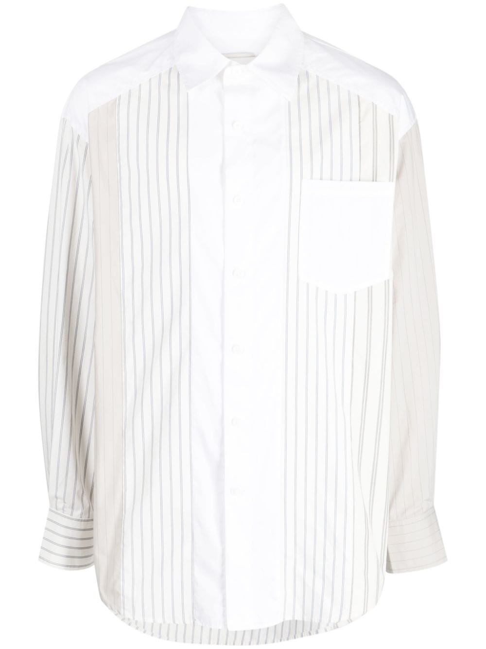 striped long-sleeve shirt Highlights - White - Cotton blend - Panelled design - Vertical stripe print - Classic collar - Concealed front button fastening - Chest patch pocket - Long sleeves - Curved hem Imported Composition Body: Cotton 60%, Polyamide 40% SIZE & FIT Model measurements Height 6 ft 2 in(1.87 m) Bust/Chest 31.49 in(80 cm) Hips 37.79 in(96 cm) Waist 27.95 in(71 cm) FittingInformation Designed for an oversized fit, offering additional room throughout Made from a lightweight non-stretch fabric This piece fits true to size – take your usual size Washing instructions Hand Wash