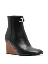 70mm wedge-heel ankle boots Showcasing the brand's mastery of elegant everyday styles, these Salvatore Ferragamo boots have a sleek silhouette designed with minimal detailing. The black leather pair sits atop a wedge heel, and is simply accented with a signature Gancini plaque at the front. Made in Italy Composition Lining: Leather 100% Sole: Rubber 100%, Leather 100% Outer: Leather 100% SIZE & FIT Measurement CIRCUMFERENCE 7.08 in(18 cm) HEEL 2.55 in(6.5 cm) HEIGHT 5.31 in(13.5 cm) Sole height 0.39 in(1 cm)