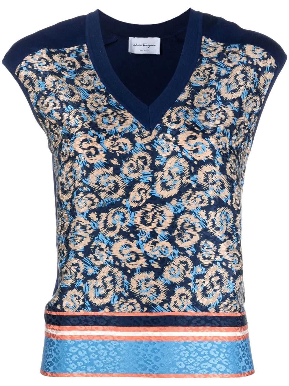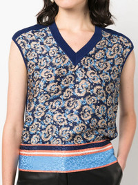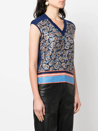 all-over graphic-print V-neck vest navy blue silk-cotton blend all-over graphic print V-neck sleeveless straight hem Made in Italy Composition Cotton 70%, Silk 30% SIZE & FIT Model measurements Height 5 ft 10 in(1.78 m) Bust/Chest 31.49 in(80 cm) Hips 36.22 in(92 cm) Waist 25.59 in(65 cm) FittingInformation This piece fits true to size. We recommend you get your regular size Cut for a slim fit Made with a lightweight fabric Washing instructions Dry Clean Only